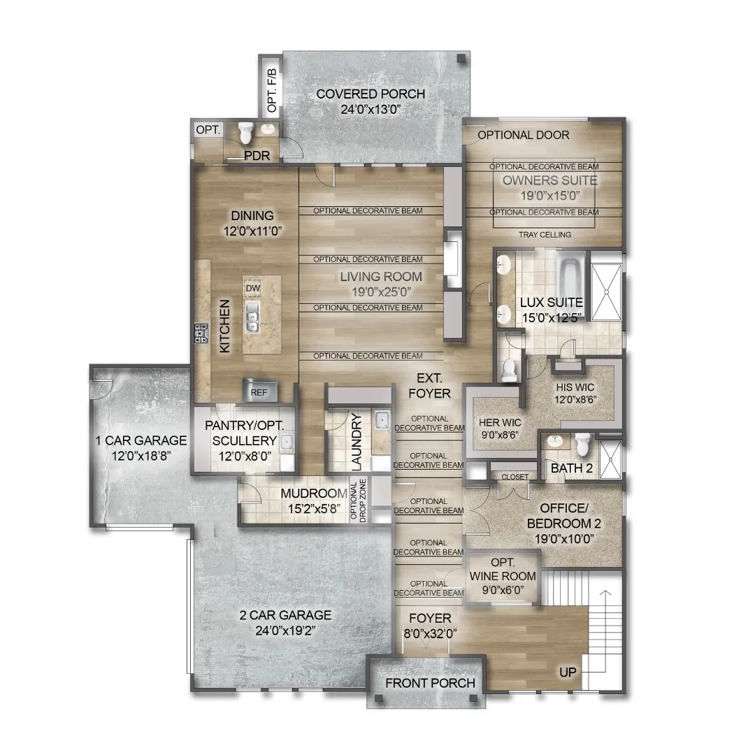 The Charleston, a thoughtfully designed primary on main elevation featuring 5 Bed | 4 Bath | 3 Car Garage | Boasting 4091 Sqft of living space. The Charleston is available in 4 elevation styles to fit your unique lifestyle needs including a covered outdoor living area. Each elevation includes a bespoke and custom feel with a 2-Story Stair Tower & Optional Upgrades such as: Wine Room, LUXE Kitchen Packages, Scullery, & In-ground Pools and MORE.